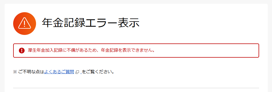 また、厚生年金加入記録に不備が生じるため以下のようなエラーメッセージが表示される状態になり年金ネットで正常に加入記録を確認することが不可能となります。